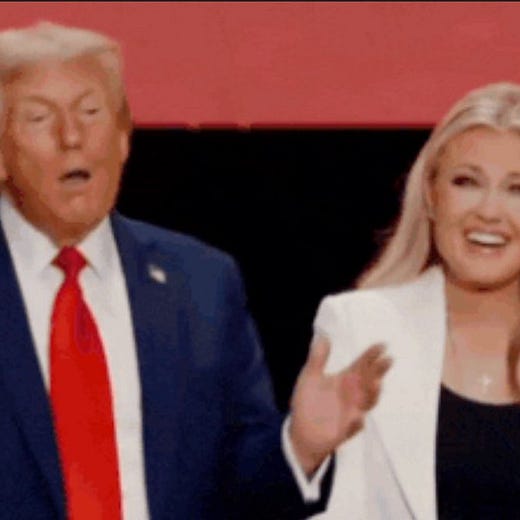 For maximum effect, in her first public appearance Erika Kirk stood before a lucite lectern to the side of his chair in his podcast studio, her divinely manicured hands resting lightly on it, moving with the precision of someone who knew every eye was on her. Each strand of her hair in perfect place, diamond rings and earrings flashing under the lights, hands clasping a cross as if it were part of the act. She thanked first responders, police, and name dropped Trump, and Vance. Then she spoke of Charlie Kirk not as a man, but as a martyr, a vessel of destiny. “He laid down his life for me, for our nation, for our children,” she said, lifting her gaze to the heavens with the practiced focus of a performer.